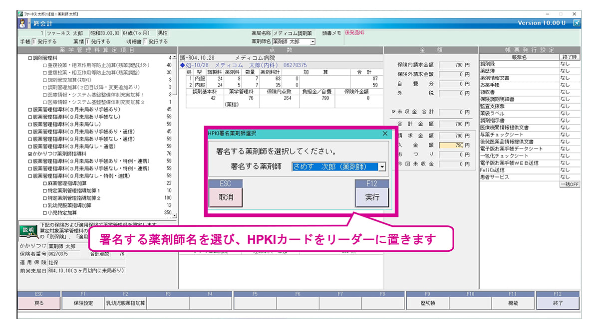 署名する薬剤師の選択とHPKIカードによる電子署名