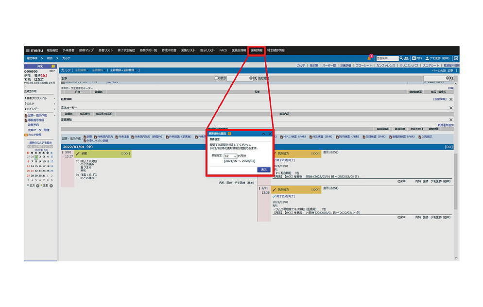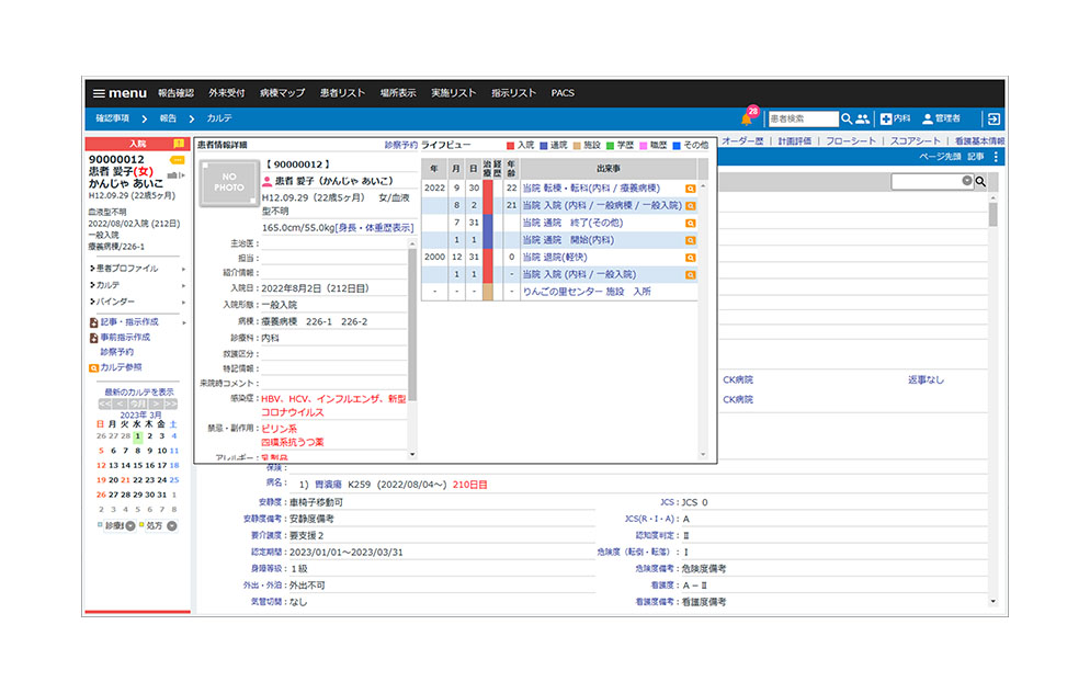 患者さんの病名、現病歴、主訴などの情報に加え、今までの治療経過を年表形式で一画面に表示できます。また、この画面から当時のカルテ記録や詳細な状況を確認することも可能です。