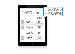 一括入力ができるので、バイタルや食事など同じ情報を複数回入力する手間が省けます。