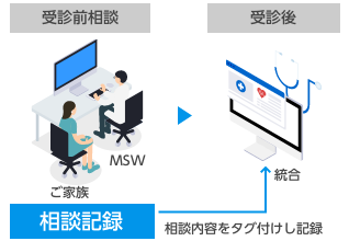 MSWとの受診前相談記録を受診後の患者カルテに統合できるので、患者さんに寄り添った診療を可能にします。
