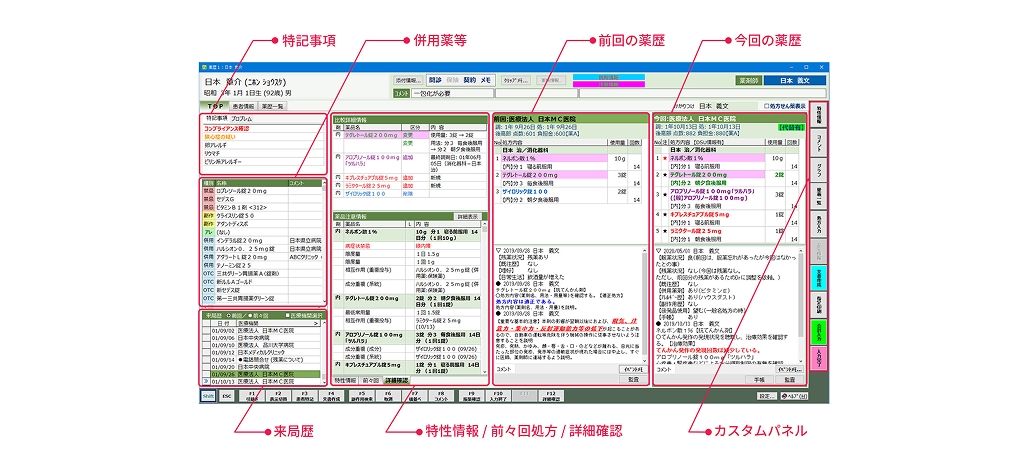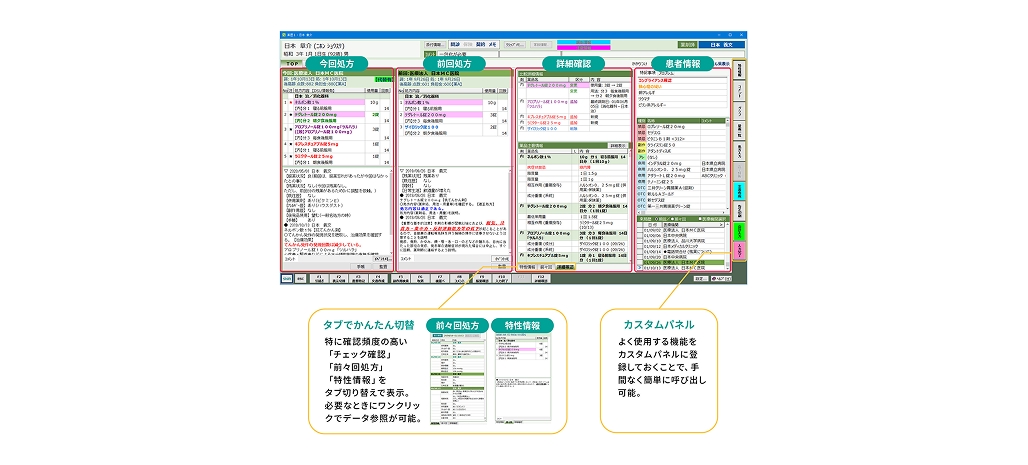 処方箋受付時や調剤監査時には後発医薬品の希望や過去の副作用歴等の患者情報を左から順に配置、投薬窓口では今回の処方内容から過去処方へと逆に配置するなど、使用する場所(端末)や使用する人(薬剤師)ごとに設定が可能。