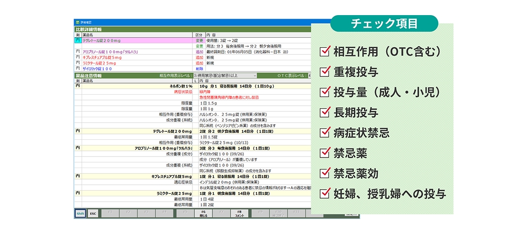 前回との処方比較やチェック結果、特性情報など、必要な情報がひと目でわかる画面レイアウト。