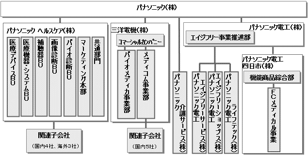 まず、2012年1月にパナソニック株式会社の新たな社内分社としてヘルスケア社が設立され、その傘下にパナソニック ヘルスケア株式会社(社長:山根 健司)、三洋電機株式会社(社長:佐野 精一郎)のバイオメディカ事業およびメディコム事業、加えてパナソニック電工株式会社のエイジフリー事業とパナソニック介護サービス株式会社がヘルスケア傘下に位置づけられます。