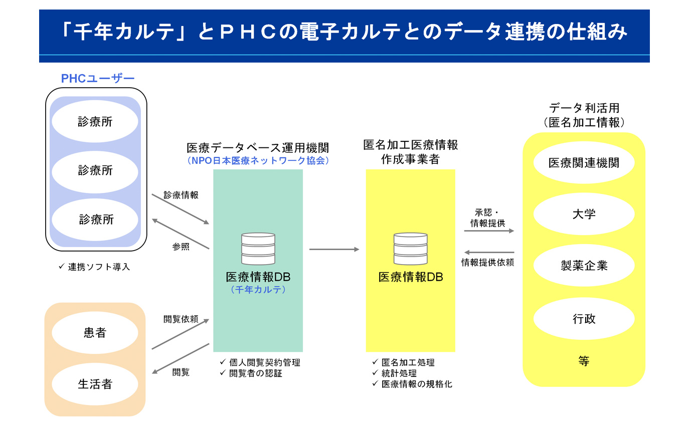 今年5月11日に施行された次世代医療基盤法(*2)によって、医療機関などが提供した患者の医療情報が匿名加工のうえ、大学などの研究機関や企業の創薬、医療機器開発およびその治療効果や評価などに関する大規模な研究などに活用できるようになりました。この度の契約に基づく実証実験では、医療機関の参加を募り、患者様から同意をいただいた上で、PHCの電子カルテシステム上の医療データを「千年カルテ」へ連携します。「千年カルテ」に蓄積された医療データは、地域を超えて患者様が安全にアクセスできるとともに、次世代医療基盤法に沿った形で二次利用することを目指します。