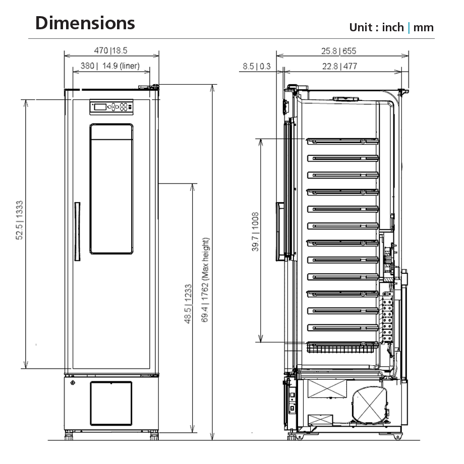 The PHCbi brand proprietary inverter compressor algorithm [ICA] modulates the compressor motor speed according to temperature need. Unlike standard on/off compressors, combined with energy-saving and environmentally friendly natural refrigerants the MPR-N200H-PA produces less heat, lower noise, and lower energy consumption.