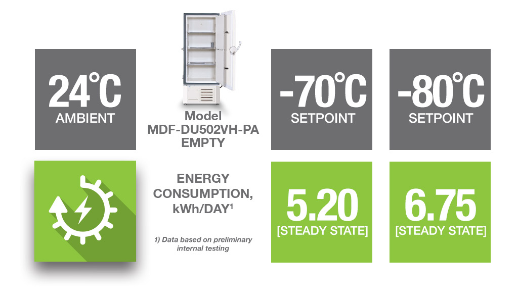 The MDF-DU502VH-PA provides reliable temperatures as low as -80°C. The MDF-DU502VH-PA is part of the VIP ECO Series of ultra-low temperature freezers. PHCbi brand VIP ECO Series ULTs have earned a worldwide reputation for dependable performance in demanding environments where critical materials must be preserved for generations.